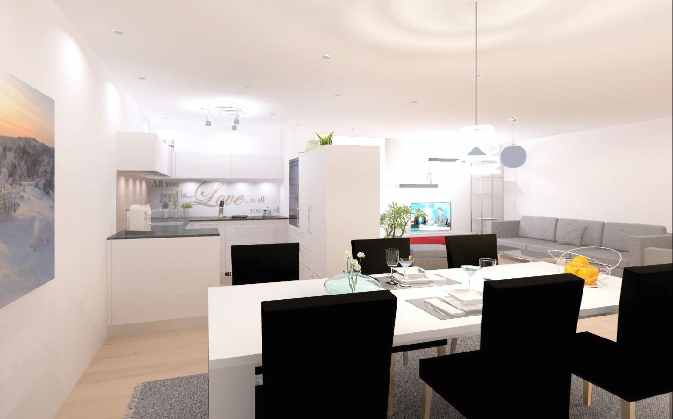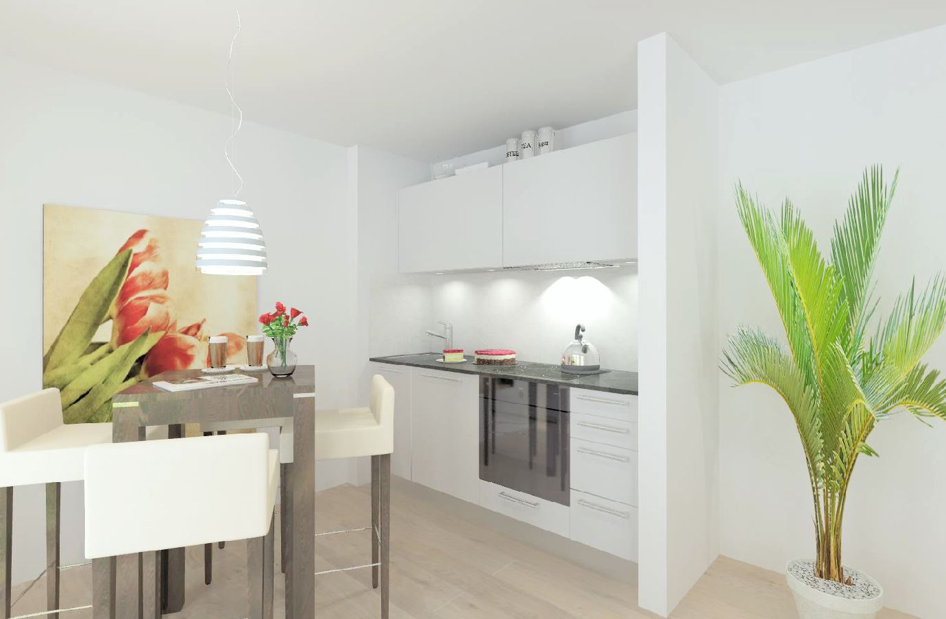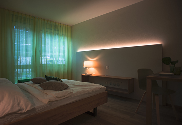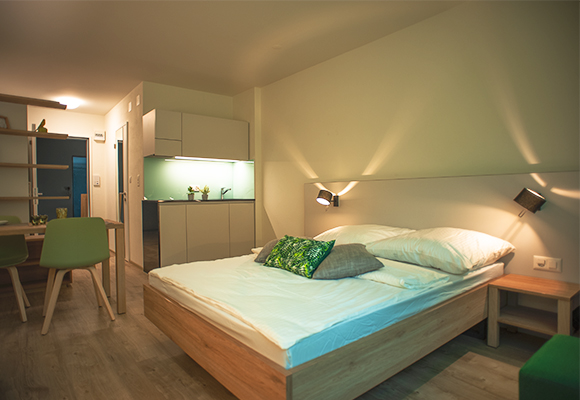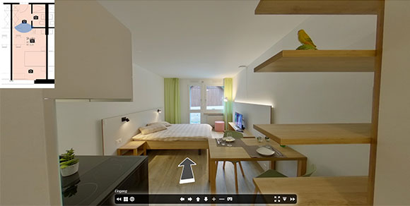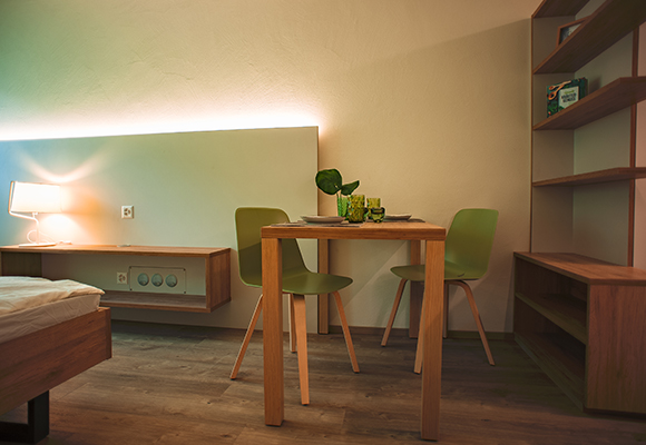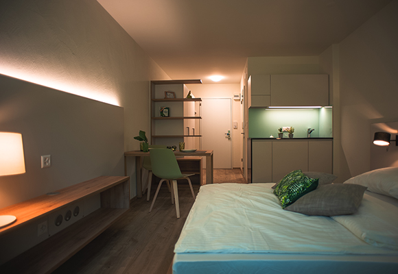 57 der 72 modernen Studios / Appartements mit Charme sind komplett möbliert. Die Einrichtung ist mit viel Liebe zum Detail gestaltet. Der Eingangsbereich ist mit einer Garderobe und Einbauschränken ausgestattet – wer gerne Ordnung hat, ist hier gut bedient. Kochnische, Essbereich und Wohnraum sind gegeneinander offen und vermitteln grosszügige Gastlichkeit.