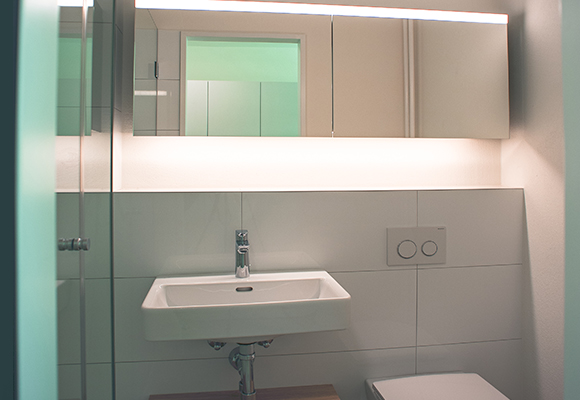 - Badezimmer/WC: separates Badezimmer, moderne Walk-in-Dusche mit Glastüre, grosse Spiegelfläche mit edler Beleuchtung, Lavabo, WC