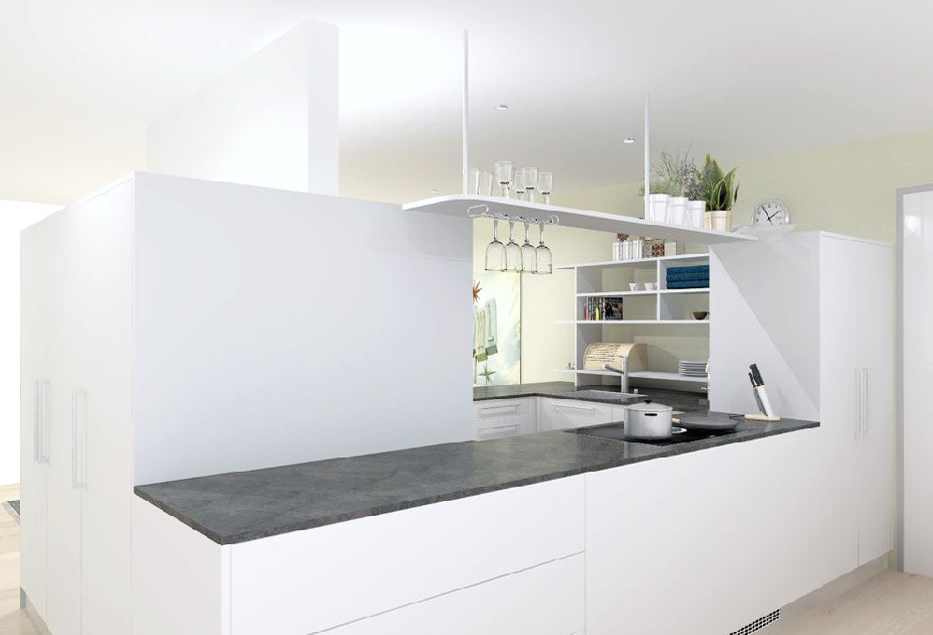 - Küchenzeile: voll ausgerüstete Kochnische mit Essecke, Glaskeramikherd, Arbeitsplatte in Naturstein, Mikrowelle, Kühlschrank
